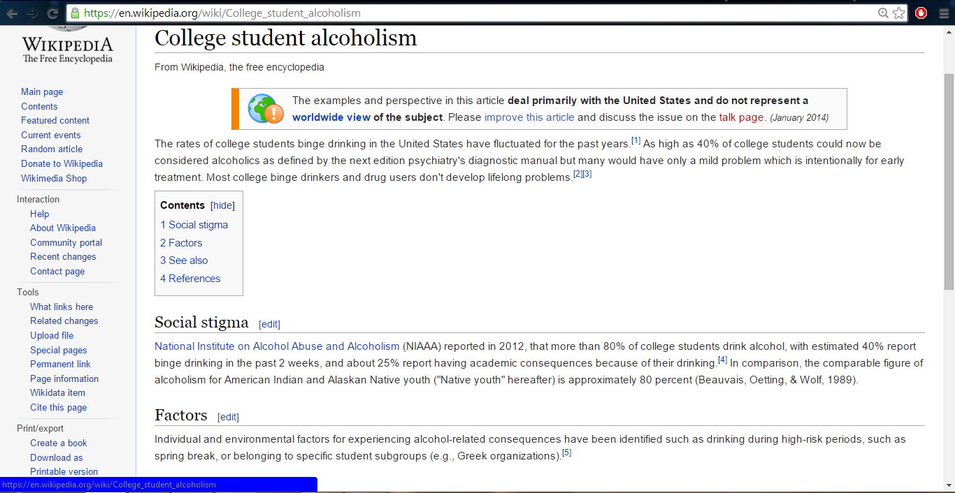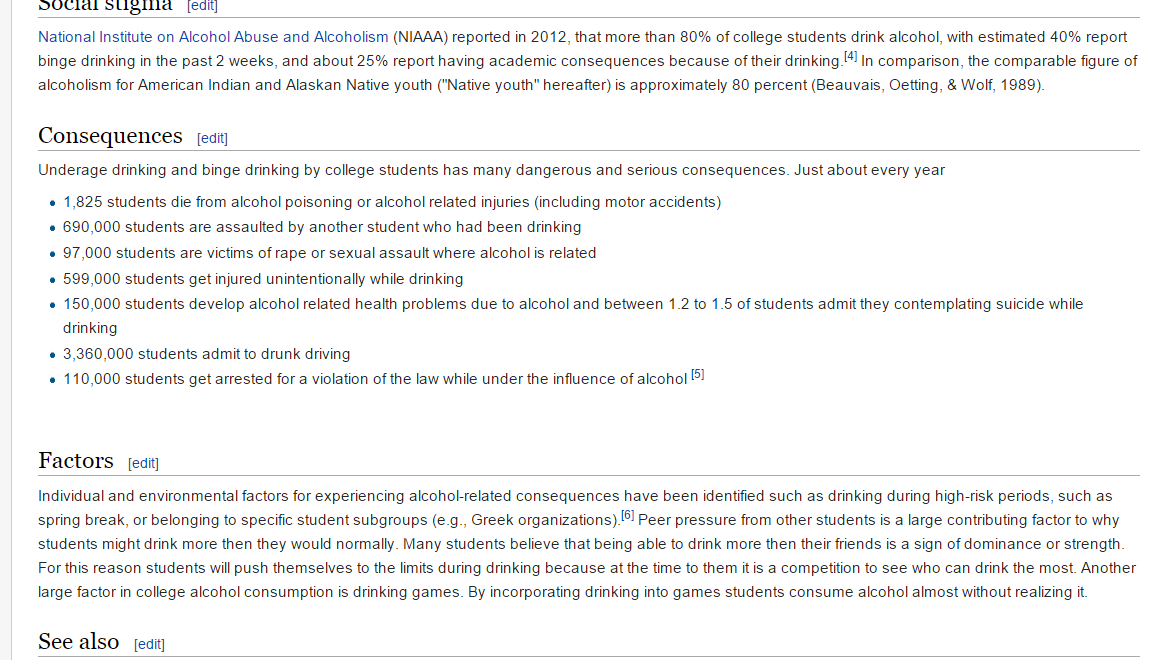 The information I added was related to the consequences college alcoholism poses on students. I also made a large contribution to the “Factors” section, where I included information on peer pressure and binge drinking that was not previously there. When I checked back the next day, it seemed that my contribution was effective enough to have stuck with this Wikipedia page. This was a rather fun assignment, because now I feel like I made a positive contribution to the internet.