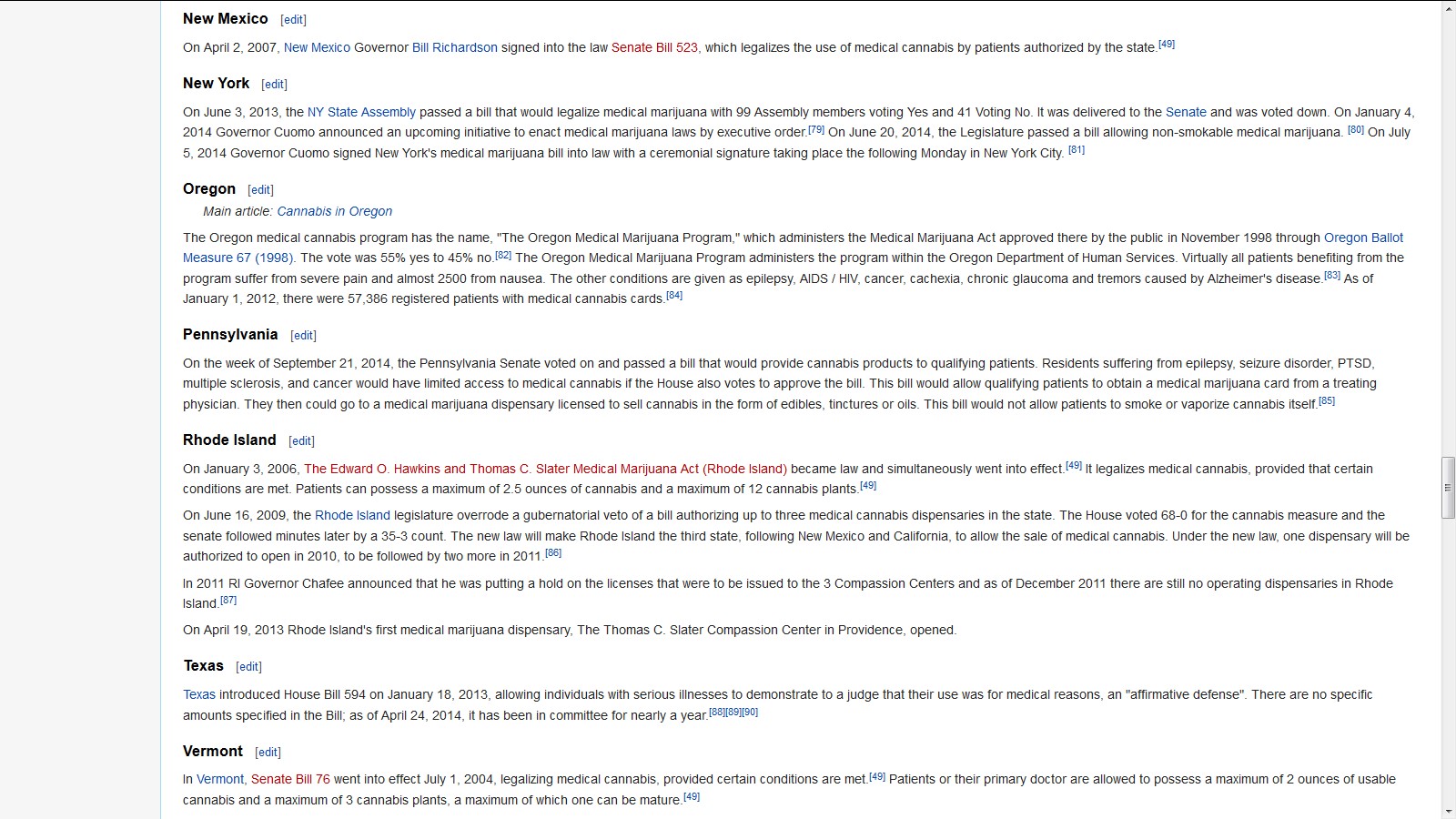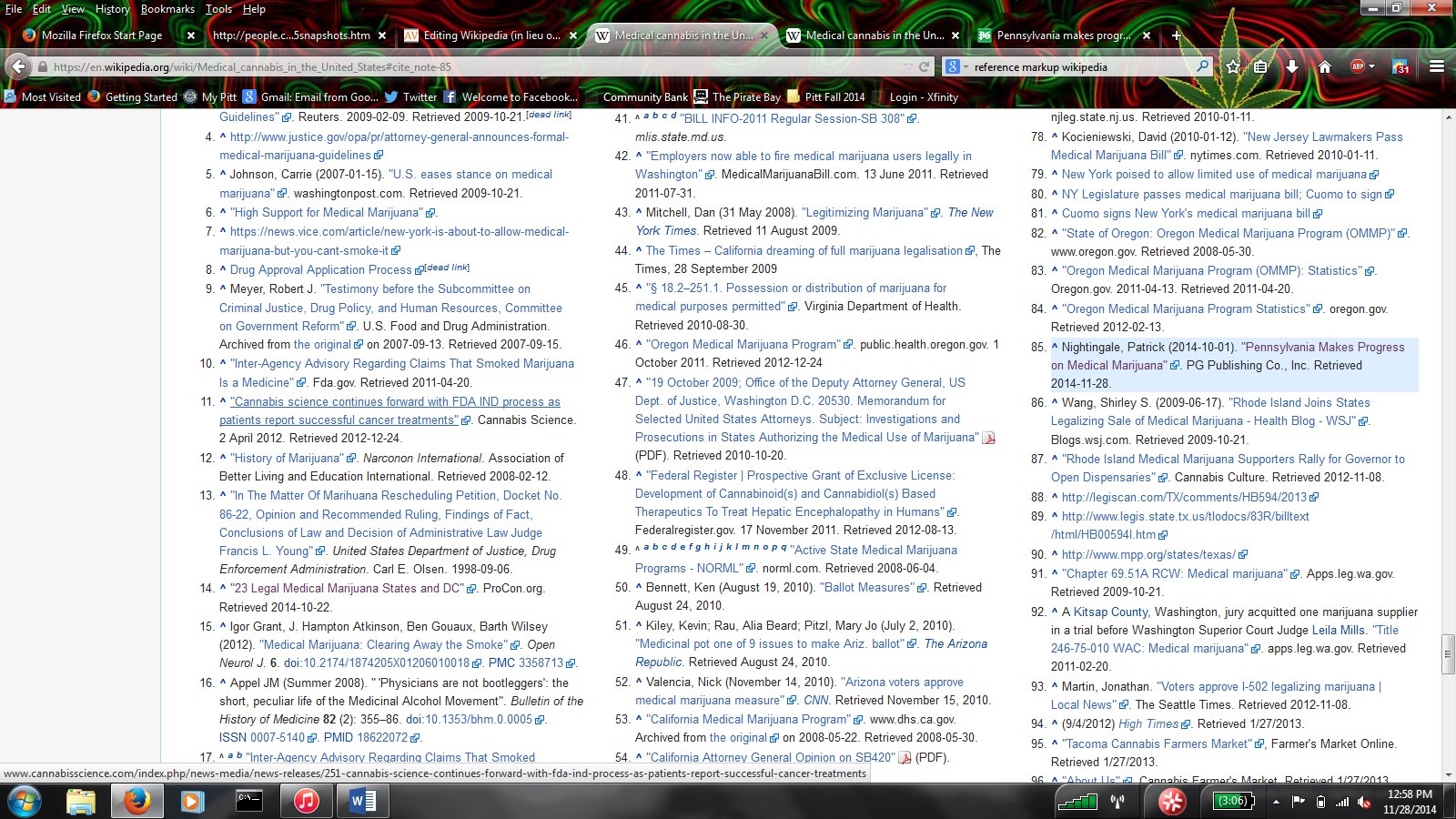 I found an article in the Post-Gazette that talks about the bill that was passed by the Senate and is currently awaiting approval in the House. I decided to use this source to create a Pennsylvania section in this article containing a citation to this article. This article talked about the bill that was just recently passed in the state senate that would legalize medical marijuana for certain patients if also passed by the house. I used the info from the article about what patients and conditions the bill would cover for medical marijuana and the date when the senate passed it in my edit.