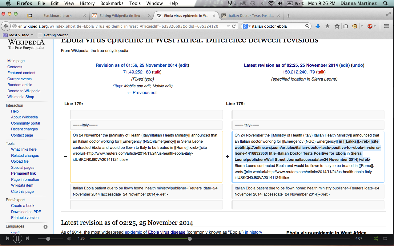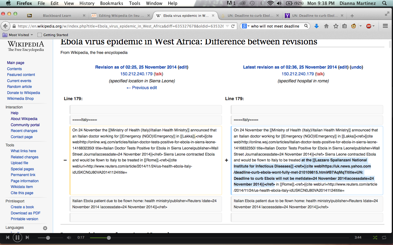 As I read the page, I found that all the information was highly accurate and detailed. It posed a challenge for me, making it more difficult to decide what exactly to add/edit. I resolved it would be best to focus on updating its information. I wanted to specifically add the news updates about the new Ebola infected patient in Italy, but noticed it had already been altered. The information was quickly added, demonstrating how quickly the editors work to ensure the page’s accuracy. I opted to make the information more detailed. Specifically, in the Italy section I included more information about the Italian patient and the location he contracted the disease. I also made a second edit that touched on W.H.O.’s projection on the contentment deadline.