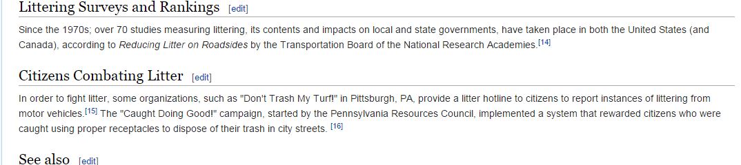 For my Wikipedia edit, I decided to start by looking at what different Wikipedia pages are available to the public that pertain to litter. I tried to find a page that dealt with litter in Pittsburgh specifically so that I could add something substantial. However, there didn’t seem to be any pages that are related directly to cities. So I went one step up to the Wikipedia page for Litter in the U.S.. This page contains only an overview of the litter issue in the U.S. and a small section titled “Littering Surveys and Rankings”. This page can be seen here. I decided to add my own section titled “Citizens Combating Litter” to provide any reader with additional information about how U.S citizens are active in the fight against litter. My edit is below.