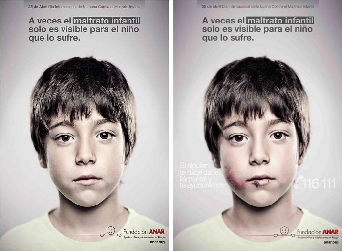 A technique called lenticular photography makes the organization’s details and contact information visible only to those of a certain height. For an average 10-year-old (around 4 feet 5 inches) the image will show a child who is bruised and hurt, along with a plea asking a child to call the organization if they are being hurt. Adults see an image of a normal child without any bruises, cuts, or scars on his face with the text “Sometimes, child abuse is only visible to the child suffering it.” The idea is that if a child is being abused and they see this poster, they will know where they can go for help without their abuser witnessing the same image.