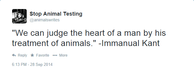 I don’t feel as though this tweet has as high of a rhetorical velocity as that of the pictures, but I think that it is effective for a few reasons. The first reason is that it uses ethos by implementing a quote from well-known philosopher. It is a very short quote and does not take much time to read, but it gives the reader a lot to think about as the subject of animal testing goes.
