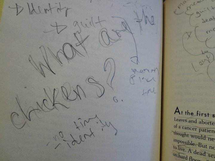 I recall disliking it and not much else, and when I re-opened the book as a course intern in summer 2011, I was struck by some giant marginalia about chickens: