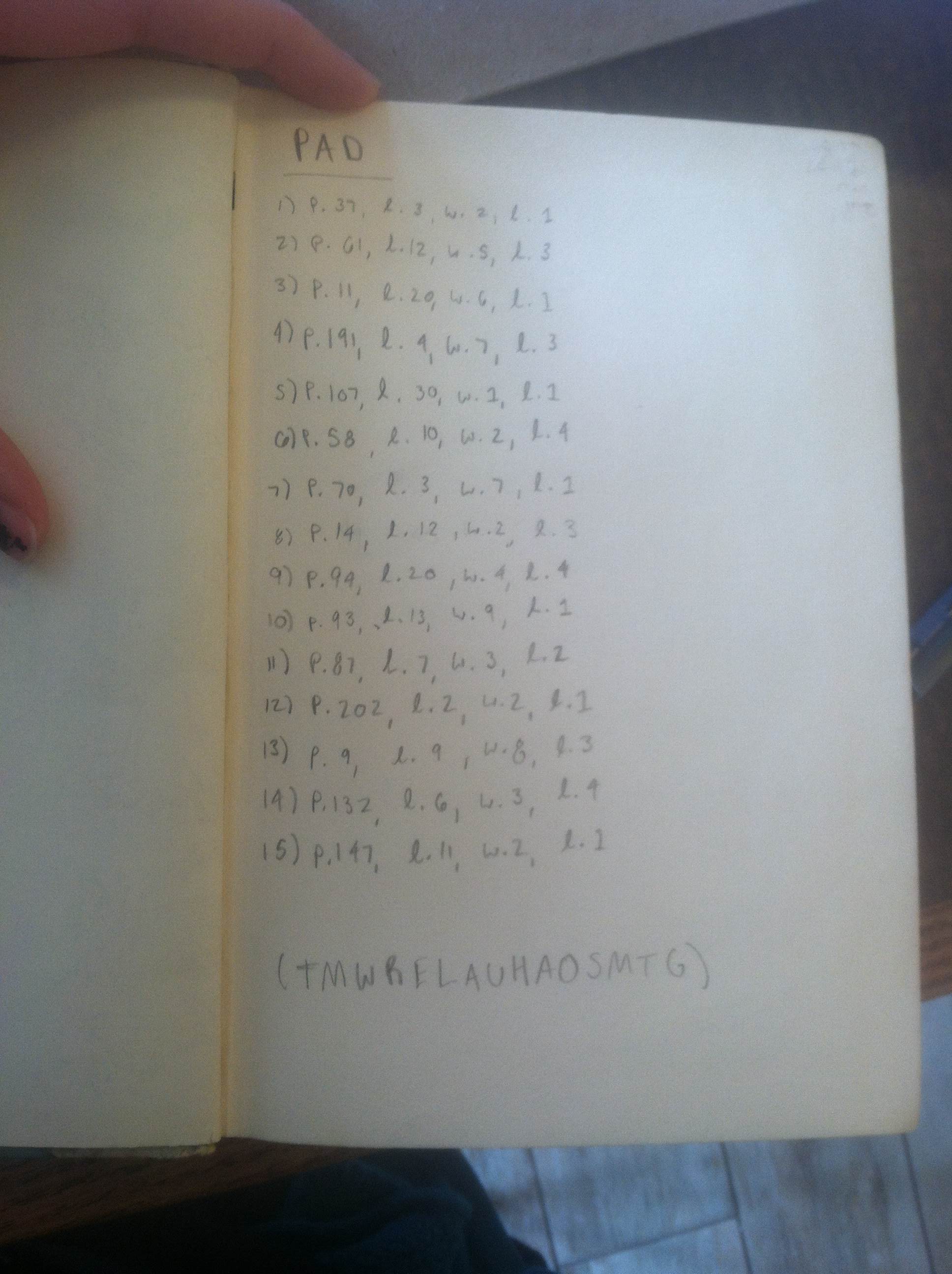 Perhaps, during wars and political intrigues, a print book was not often actually used as the generative “key” to an encrypted message—probably too cute. However, my point might be that direction through encrypted inscription is not only appropriate to digital materials. One could argue that it is most appropriate to digital materials. But what materials and technologies enabled this kind of writing originally? What made cryptography seem “appropriate” to the human mind? Are there ways or methods of reading and writing, and thinking about reading and writing, that seem to connect to this act of inscription? And how does this question relate to the “History of the Book,” which is also often the history of the printing press, and the history of something called “modern society”?