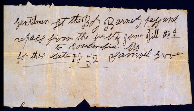 A slave pass signed by Samuel Grove, permits “the Boy Barney” to pass and repass to Columbia, MO from the first to the fourth of June for this date in 1852. This pass is a complicated and sad story about slavery, literacy, and escape.