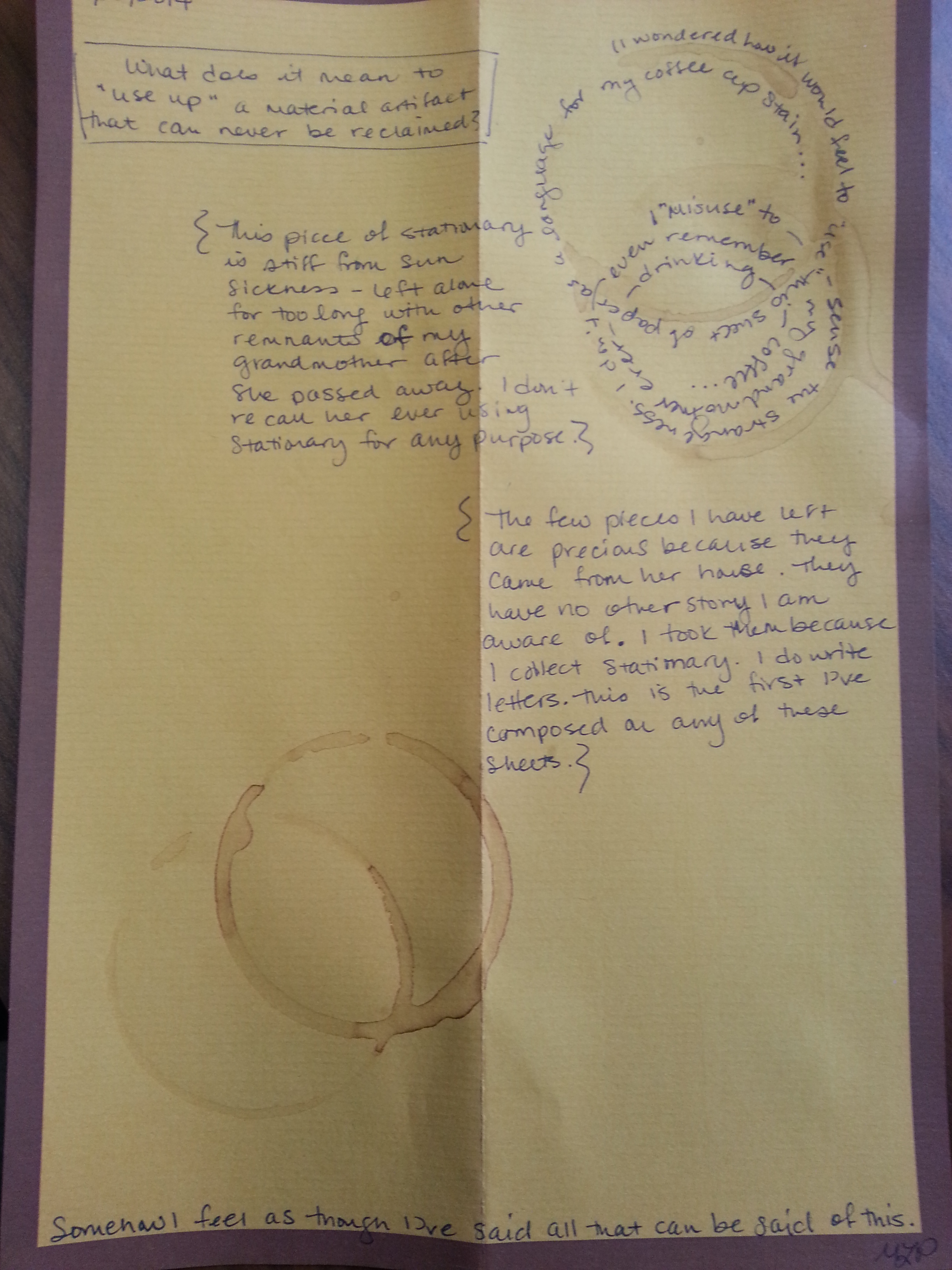 I borrowed the tea (in my case coffee) ring idea from the poet Susan Tichy, whose tea poems (visual poems with tea rings) chronicled her morning tea drinking. The ephemera of it. I compose this as much as I write it. A part of a morning ritual of reflection… a reflection that begins where they day’s writing and reading begins, but that which takes me through a bit of lost family material. There’s nothing special about this paper or its preciousness. This image is more the blog post than these ramblings. Not sure what I did here, just that it all feels rather incomplete.