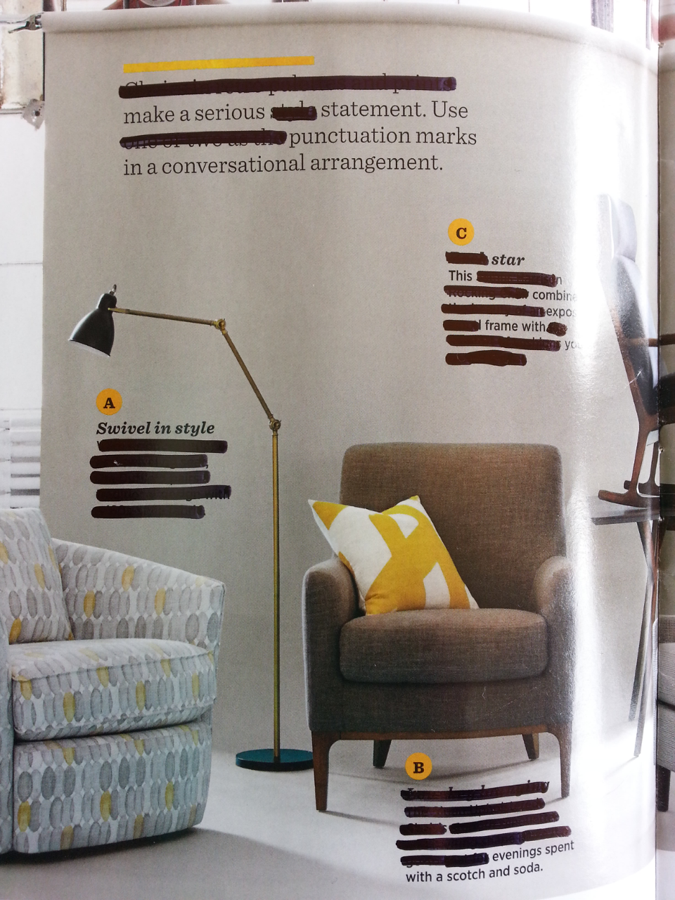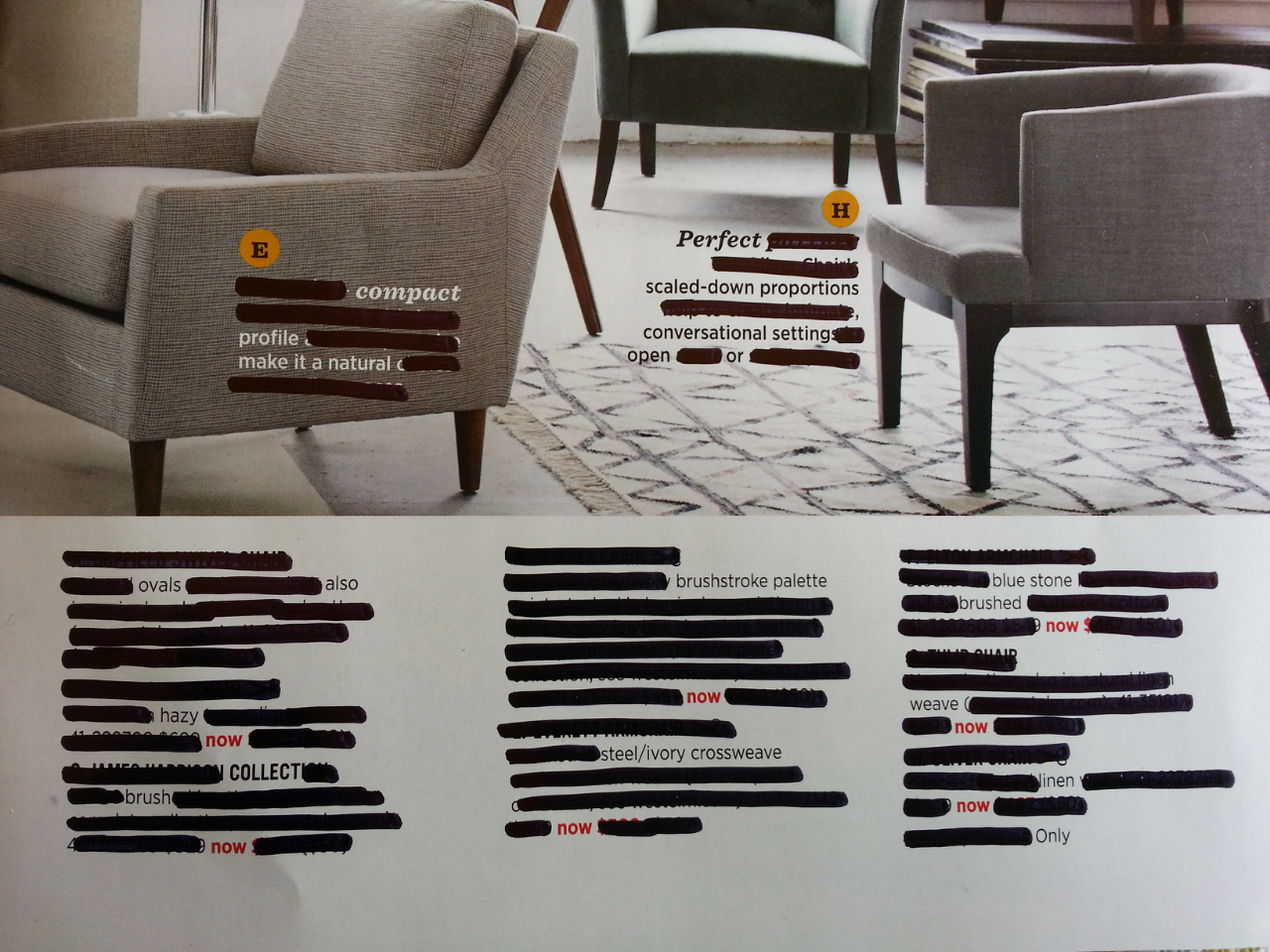 It also became evident to me the labor involved with constructing these catalogs… the diagrammatic choices as much as developing the lexicon. The pages have to feel consistent. It’s as though the makers agreed upon a set of words from which to choose to describe these mid-century-inspired furniture pieces and textiles, the way I’ve chosen those words to redact. This is certainly a work that is as much designed as it is written.