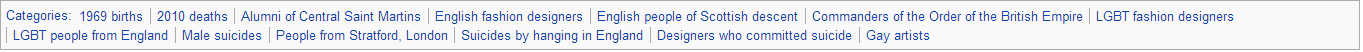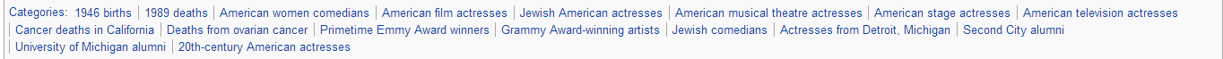 So what I’m presenting as my file, then, isn’t actually a list of objects so much as a way of thinking about them. The same document could be filed in seventeen different ways, if we use Gilda as an example, and that says cool things about Nelson’s idea of the impossibly large knowledge bank. And frankly, are any of us going to get to the bottom of the Fictional Gay Men well? Or the Male Suicides? When we categorize Wikipedia pages like this, there isn’t really anything more than a symbolic gesture towards completion. The pages are always being updated. (My personal favorite Wikipedia portal header is the one for serial killers – “Please do not add to this page by killing anyone.”)