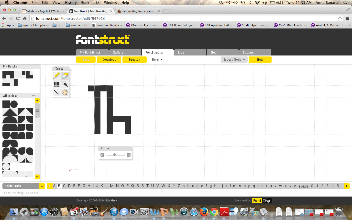 I wanted to design my own version of Dr. Seuss, one completely sans serif and without lilting counters, BUT with a certain lilting character to the lines, an almost-italics-but-not-really (in bad taste.) That’s how I write, my upright, vertical lines tend to lilt to the right, merging with the next letter, and refusing to remain upright. Something about this seems Seussian. However, I completely failed at finishing the task in either fonstruct or myscriptfont in a reasonable amount of time. With fonstruct, I couldn’t judge how the letters looked TOGETHER, side by side, if I followed it’s letter by letter format. When I tried to just write a sentence within a one-letter space it started glitching out on me. Also, the bricks weren’t allowing me to design a lilting font anyway.