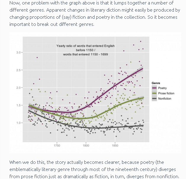 The picture becomes more nuanced with poetry rising, prose fiction rising (though, less so than poetry), and nonfiction declining. Underwood and Sellers further complicate this picture by slicing the data along more specific genres. They describe the issue with drama and then start to discuss the problem of viewing too absolute and certain a distinction in change of language between literary texts and nonfiction texts because of the heterogeneity of genres. Going away from a previous argument (or “solution”), this leads to looking at a new dataset in a new way here: