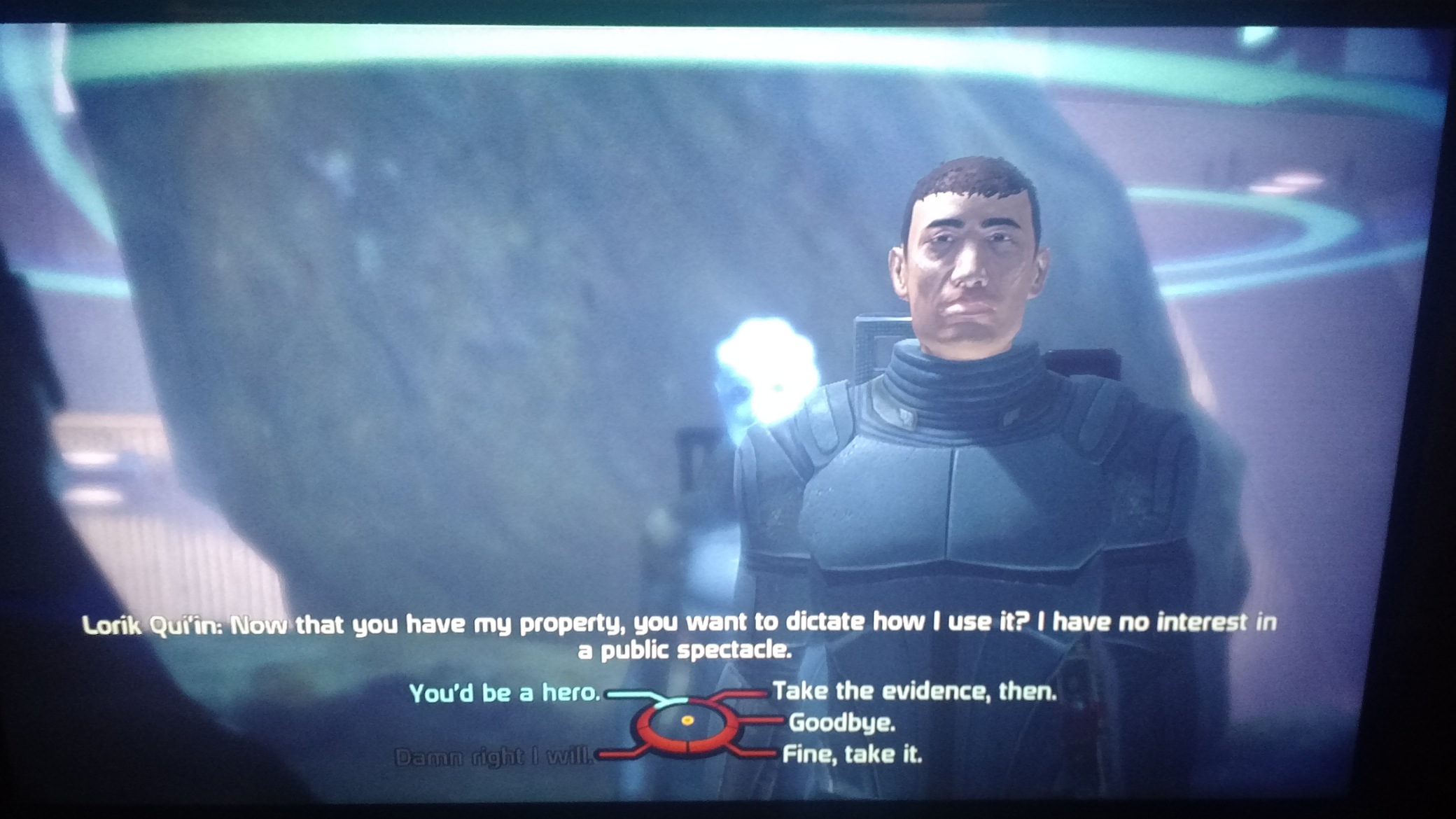 Building on Wardrip-Fruin’s work on quest- and dialogue-trees within KoTOR, I was interested in interrogating whether Mass Effect, BioWare’s next “nonlinear” franchise, might contain corrections to the problem of broken quest-trees. I was also interested in whether Mass Effect broke from KoTOR’s binarism, where the gameplay outcomes within individual quests almost always follow one-or-the-other, if/or logic. I learned that Mass Effect, while often having the appearance of nonlinear, free choice, is rather much like its predecessor(s) in the KoTOR franchise. One can feel, see, and predict the “good” or “bad” choices they are making, to the point that certain skills you can earn within the game (“Charm” and “Vagabond,” respectively) will alert you to a moment where you will be forced to make some kind of final, binary choice.