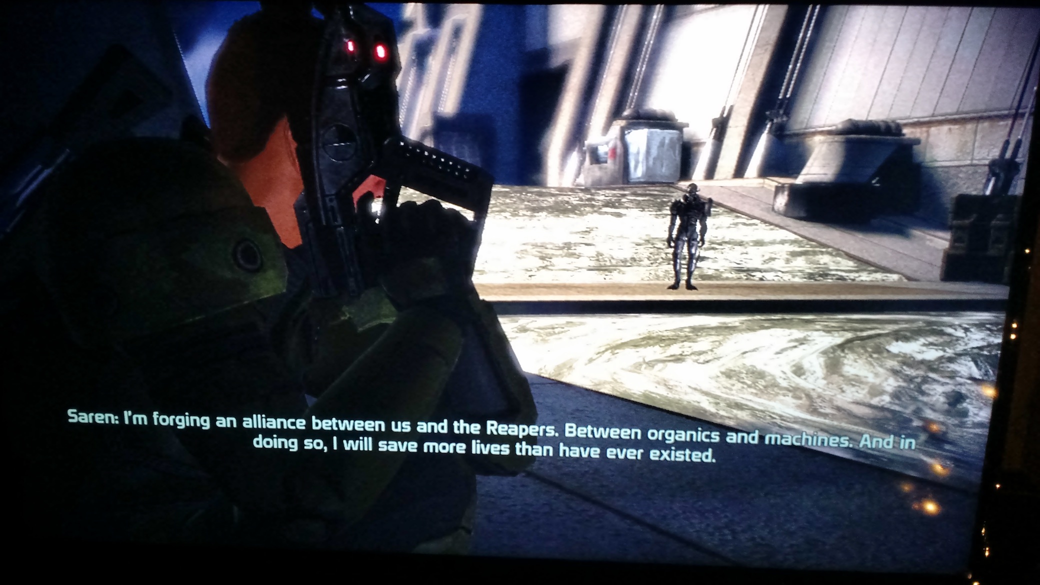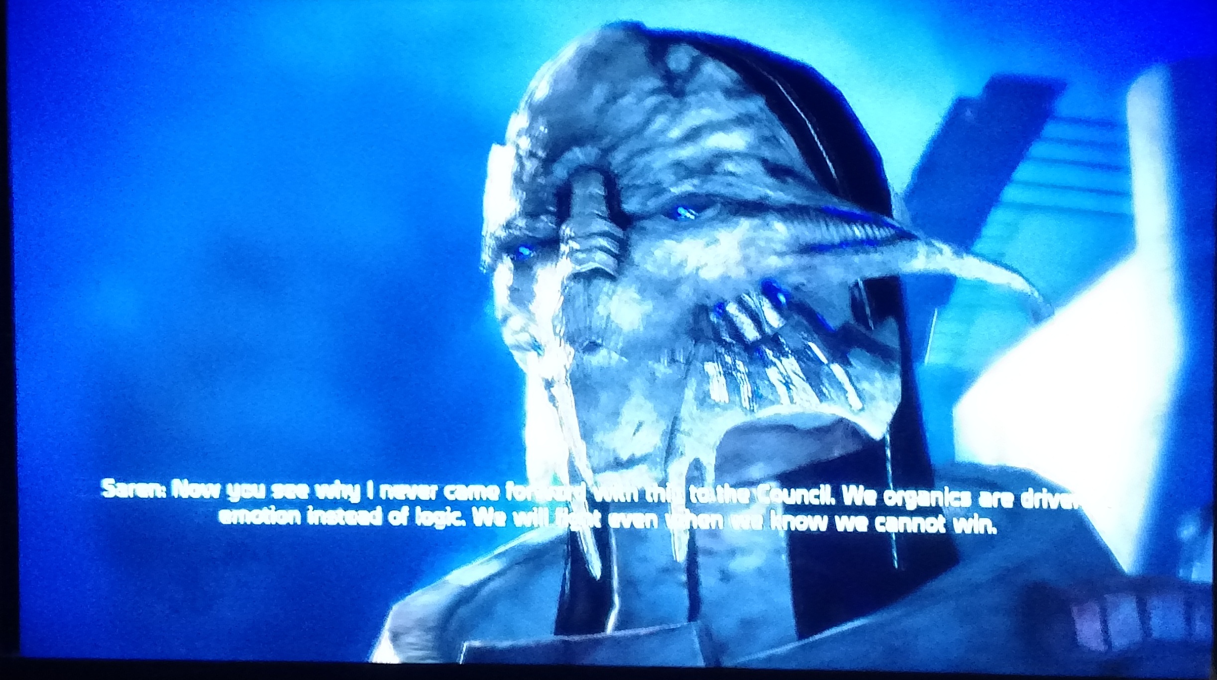 In the longer, “more-academic” version of this project, I attempt to interrogate not only how Mass Effect fails in similar or different fashion from KotOR, but also how it acknowledges this structure of potential failure through a cyborg narrative that seeks to make its player think seriously about the problems of binary logics or thinking. I want to examine and write through the game’s failures while also explaining how it acknowledges these failures, in a mode of narrative and gameplay-centered self-reference that might force the player to realize just how-guided their path through the game might be; while there are so many choices to be made within its narrative(s), Mass Effect also plays itself, in some ways, creating a cyborg gameplay structure where organic and cybernetic agencies must cooperate to create a meaningful narrative.