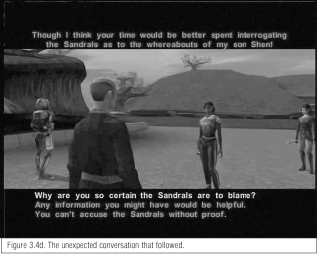 For his example on the weird narrativity of KotOR, Wardrip-Fruin narrates a play-through of the game in which he completes a quest on Dantooine, proceeding through a dialogue tree with a woman whose lover has been captured by her father, agreeing to use her key to free him, then talking both families’ fathers out of an ambush and battle, through some dialogue-tree finesse. He then takes his character to the male lover’s compound, where the male lover’s father requests, on two separate visits, that the player rescue his son, the one we have already seen being taken back to the compound. Wardrip-Fruin then returns to the female lover’s estate, seeking to report on another, unrelated, quest, a death in that family, only to find that the estate has emptied out, with no unplayable characters with which to speak (63-65). Because of the computational path of the quest tree, one which can be felt but not entirely read or understood, not much makes narrative sense, although it is clear that there was some expectation, among the coders of the game, that the player would visit the male lover’s compound first. Without any intention to do so, Wardrip-Fruin shut down a tree of possibilities within the game, with no recourse to correct himself but load an old save file or play through again, with the coders’ ordering in mind. He has revealed the basic, binary structure of computing present in a game that wants to pretend such formulations do not exist; he can either do things his way, or more-linearly as the programmers intended, though to totally pursue his own path would be to close off the possibility of extra XP or a feeling of completion within the nondiegetic, external rules that a “serious gamer” might try to pursue in order to elicit a feeling of completion out of the text.